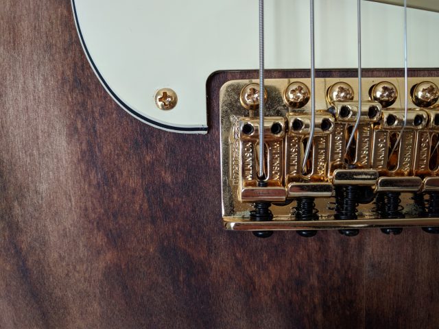 ネックとボディを別々で買った場合や、ブリッジの相性というかそういう加減で弦高が「低すぎてヤバい」ことになる場合があります。そういうときはまずトレモロをフローティング出来るようにして若干稼ぎましょう。 それでもどうにもならない場合はサドルのイモネジを長いものへ替える。