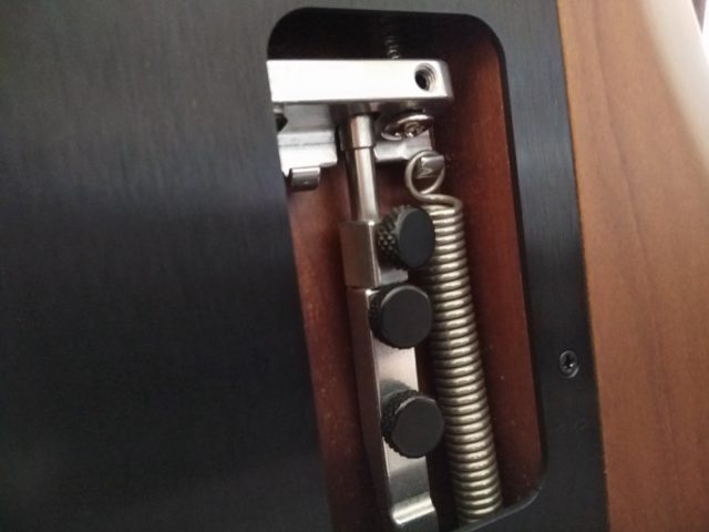 トレモロノーが装着されているので、ハードテイル・ダウンオンリー・フリーと使い分けできますが、基本的にダウンオンリーにしておく感じですかね。そもそもアームって私はあまり使わないんですがね。