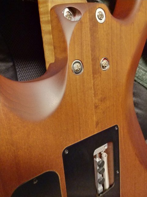 ネック同様ボディもキャラメライズド。つまりロースト加工です。どセンターの2PCバスウッドバック。どうも高級ギターほどバスウッド傾向になるのは面白いと思います。
