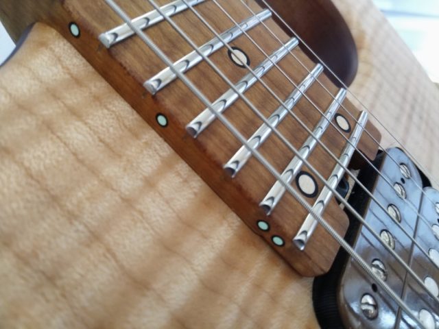 フレットの処理は端が球面ではない、オーソドックスな仕上げ。ステンレスフレット最高ですよね。世の中全部ステンジャンボフレットになればいいのに。