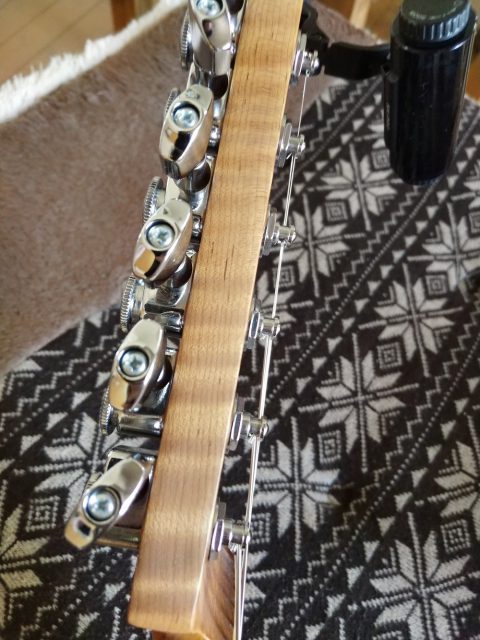 ペグポストは弦によって高さが異なるタイプ。これのせいで弦のテンション感強め。ストラトに慣れている人だと2音チョーキングとかは凄くつらいです。ストリングガイドなしでもビンビンのテンションです。3弦2音チョーキングは死ねるレベル。