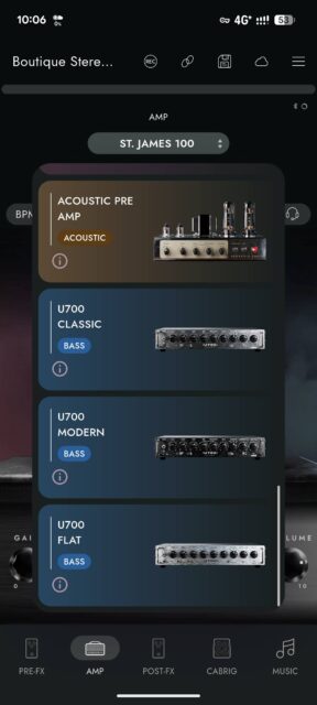 BEAM SOLOにはアコギアンプモデルとベースアンプもちゃんとありますのでご安心を。やはり本機のメリットはUSBオーディオインターフェイスとしての機能ですかね。サウンドはCabRig以降のBlackstarなので、よくある歪みすぎだけど不自然にはならないとは思います。