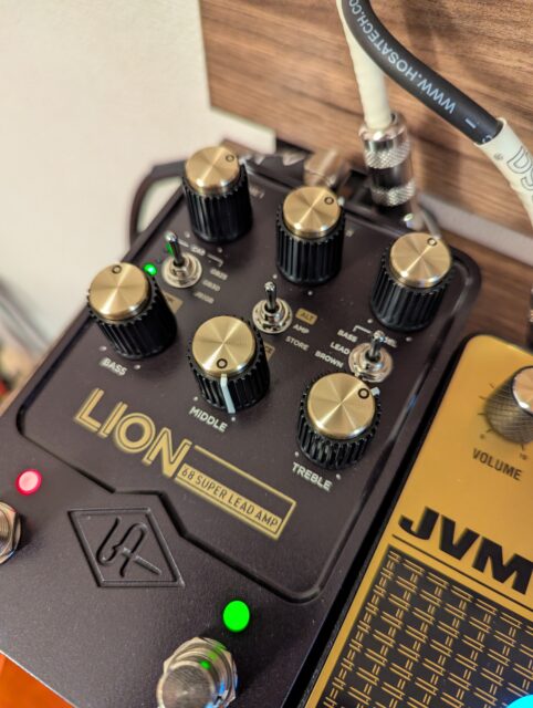 UAFXのLIONはこの設定。ブーストは1時位置で、Super Leadアンプをチョイス。Vol1とVol2はほぼ1時位置。これでバシバシのハイゲインですね。ここまで歪めば単音弾きでも弾きにくいなんてことは無いです。サスティンの伸びも良きです。